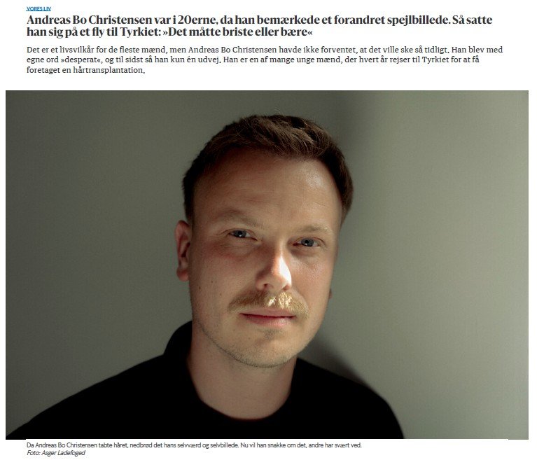 Andreas Bo Christensen fortæller i en Berlingske artikel om sine tanker og overvejelser, inden han besluttede sig for at få foretaget en hårtransplantation hos Håreksperten. Andreas følte sig tryg under hele forløbet med os. Faktisk så meget, at han har fået foretaget to hårtransplantationer. Det er vi selvfølgelig stolte af. Tryghed og professionalisme er altafgørende for os, og vi er med vores klienter fra start til slut.
